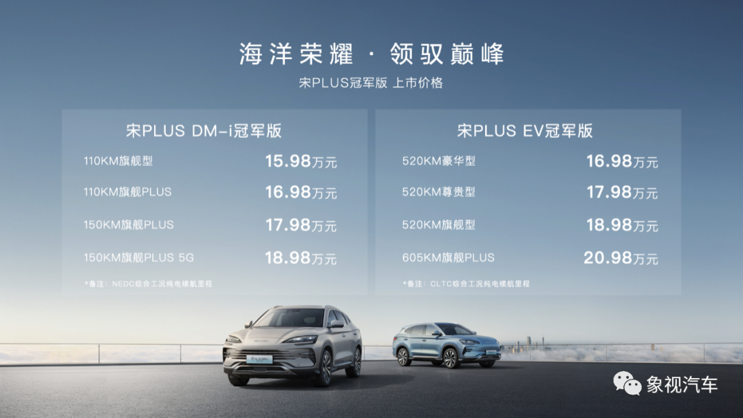 宋PLUS冠军版中,宋PLUS DM-i冠军版共4款车型,售价15.98万元-18.98万元,宋PLUS EV冠军版共4款车型,售价16.98万元-20.98万元,均比此前预售价格区间降低一万。