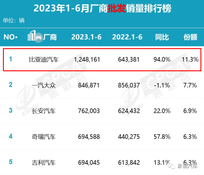 包括一汽大众在内的其他车企,今年上半年累计销量均未超90万辆,而遥遥领先的比亚迪则高达125万辆。