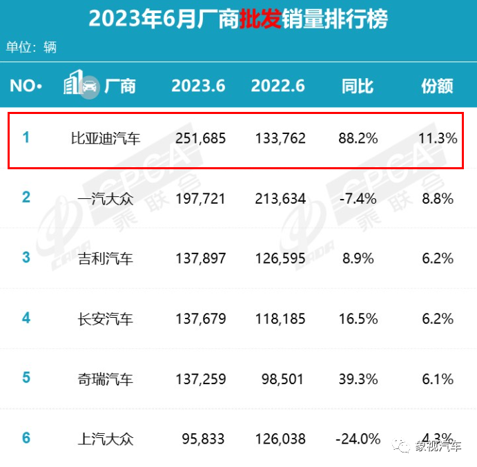 当然,说到车市最大的亮点,依旧要看当红炸子鸡比亚迪。6月份比亚迪爆卖超25万辆,同比暴涨88.2%,月销再次创下新高,捅破了自主品牌月销量天花板。
