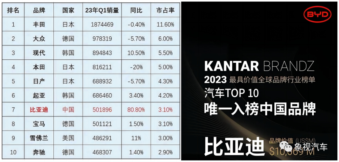 今年一季度,比亚迪大卖超50万辆,将宝马、雪佛兰和奔驰甩在身后,在全球十大车企中位列第七。