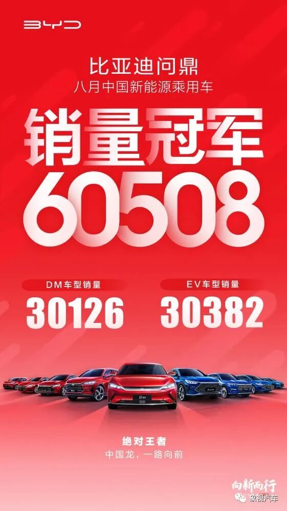 今年以来,进入收获季的比亚迪,销量持续高涨。数据显示,8月份比亚迪总销量为67630辆,同比增长90.5%,新能源汽车销量同比暴涨331.9%达60508辆,实现了新能源汽车月销三连冠。其中,DM混动车型销售30126辆,EV纯电车型销售30382辆,各自占据半壁江山。
