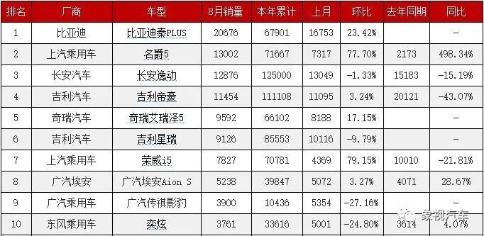 8月份自主轿车销量排行榜显示,无论是常青树帝豪,还是后来者逸动,都没能占据榜首的位置。让人颇感意外的是,在榜单上排名第一是大黑马比亚迪秦PLUS,它力压帝豪、逸动、名爵5等车型,成为新一代“家轿王”。