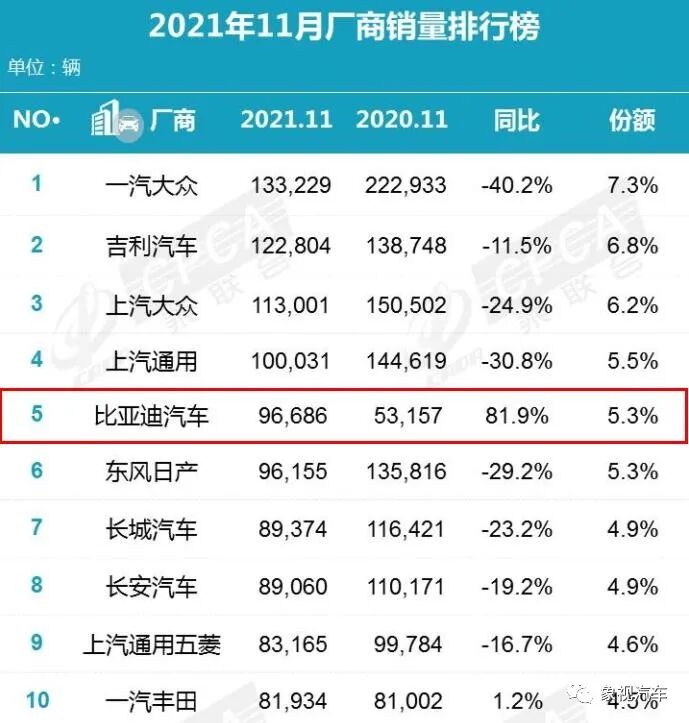 更为重要的是,在整体销量上,比亚迪后来居上,杀入五强榜单。乘联会数据显示,11月比亚迪销量暴涨81.9%至9.67万辆,在车企排行榜上高居第五名,强势杀入五强榜。