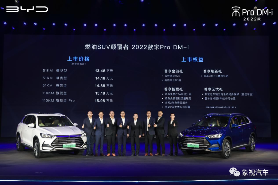 比亚迪DM-i车型的起售价,全部都在10万元以上,这属于合资品牌传统势力范围。近日上市的2022款宋Pro DM-i,定位是“燃油SUV颠覆者”,官方指导价13.48万元—15.98万元。