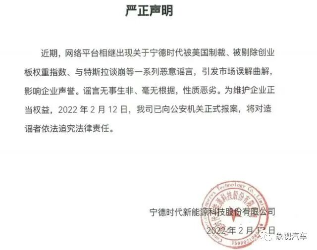 对于上述两条传闻,宁德时代“怒”了,发布一则严正声明,称网络平台出现宁德时代被美国制裁、与特斯拉谈崩等一系列恶意谣言,引发市场误解曲解,公司已经向公安机关正式报案,将对造谣者依法追究法律责任。