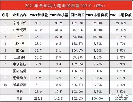 2021年全球动力电池装机量十强榜单显示,宁德时代依旧稳坐世界第一的宝座,在全球的市场份额近三分之一,总装机量高达96.7GWh,比第二名LG新能源和第三名松下装机量的总和,还要多上一点。由此可见宁德时代的强大之处。