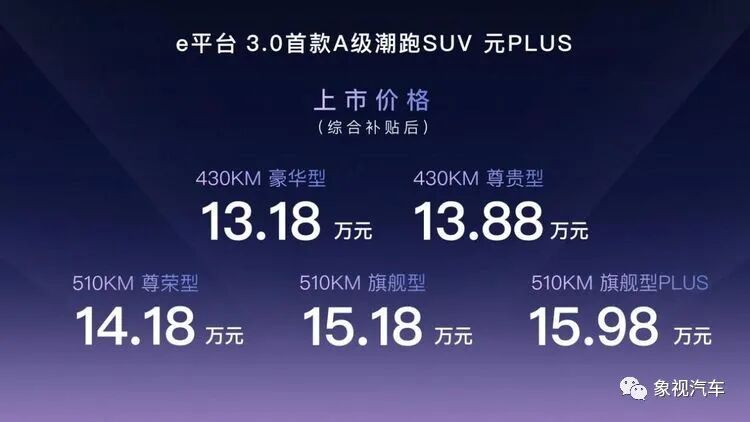 2月19日,比亚迪e平台3.0首款A级潮跑SUV——元PLUS正式上市,新车共5款车型,官方指导价13.18万元——15.98万元,并推出五大专享礼遇。
