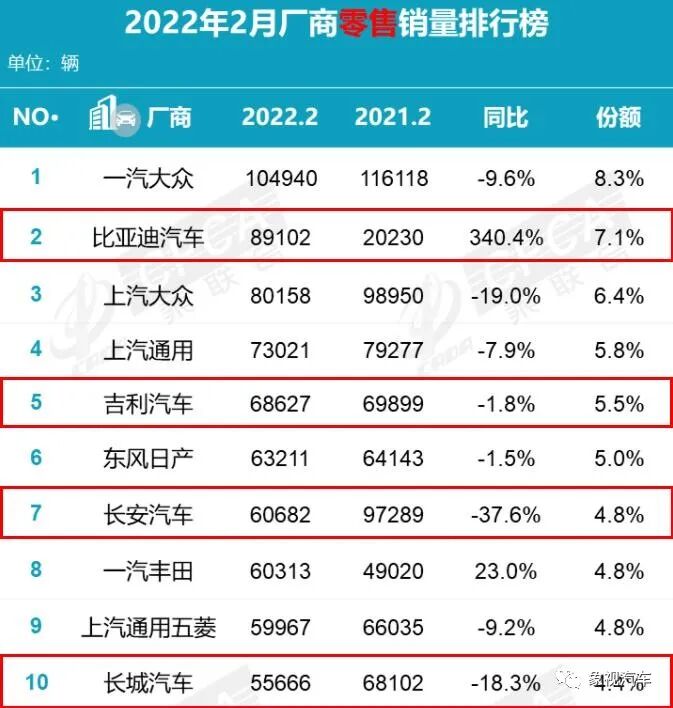 反观比亚迪,同期零售销量高达89102台,同比暴涨340.4%,力压传统自主三强,成为新的自主销冠,同时仅次于一汽大众,在所有车企中高居第二名。