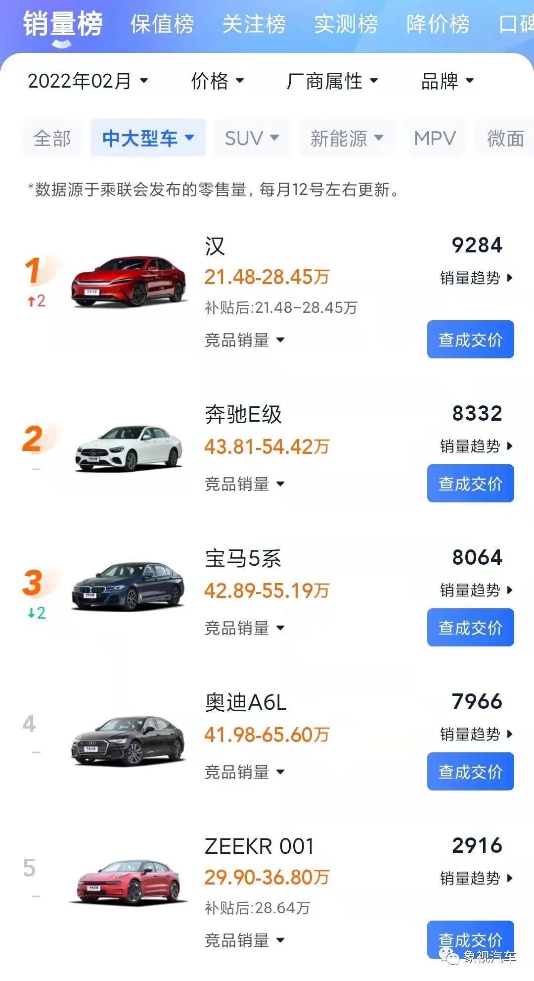 乘联会数据显示,今年2月份,比亚迪汉销量为9284台,在中大型SUV销量排行榜上高居首位,排在其后的是奔驰E级销量为8332台,排名第二;宝马5系为8064台,排名第三;奥迪A6L为7966台,排名第四。