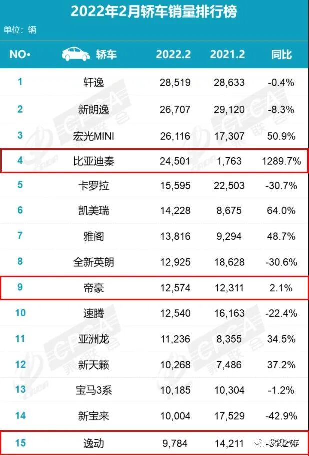 乘联会数据显示,2月份比亚迪秦销量高达24501台,同比暴涨1289.7%,力压吉利帝豪的12574台和长安逸动的9784台,在自主家轿中排名第一。