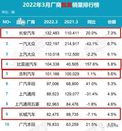 乘联会数据显示,3月份自主品牌的批发销量,长安为13.2万辆排名第一,比亚迪10.4万辆排名第二,吉利10.1万辆排名第三,长城8.2万辆排名第四。
