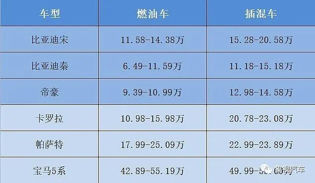 反观外资品牌,卡罗拉燃油车起售价10.98万,插混起售价20.78万,两者相差近10万元,帕萨特和宝马5系也是如此。