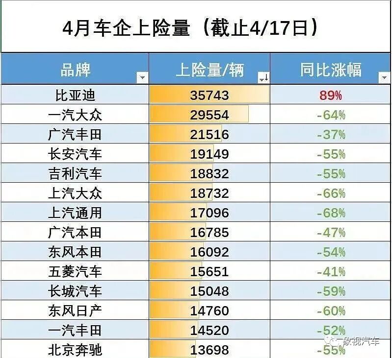 最近网上流传一份4月份车企上险量表格,包括南北大众、上汽通用、一汽丰田在内的合资巨头,以及长安、吉利、长城在内的头部自主车企,上险量均遭腰斩,如此断崖式下跌,让人触目惊心。