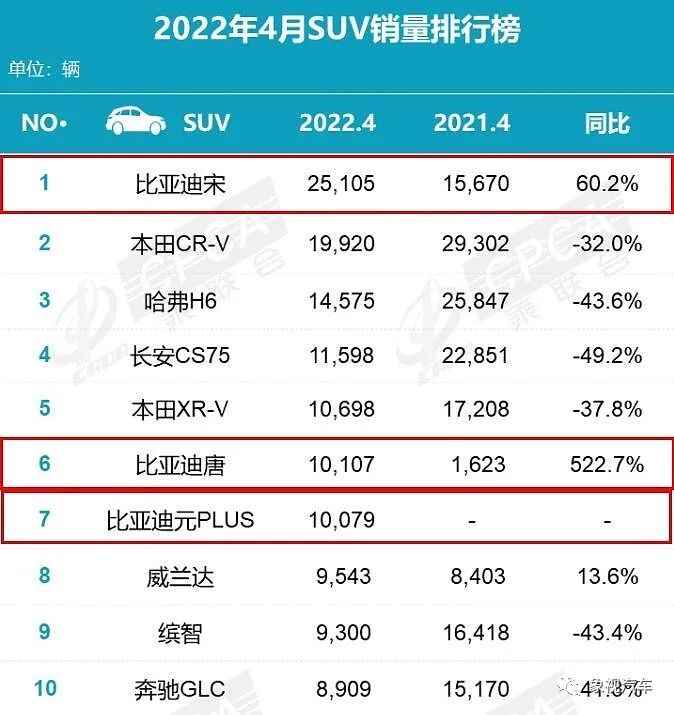 关键时候,比亚迪宋站了出来。乘联会数据显示,比亚迪宋销量为25105辆,同比大涨60.2%,超越本田CR-V等竞品,成为SUV销冠。而且今年1-4月,比亚迪宋也以98809辆的成绩,位居SUV销量排行榜榜首。
