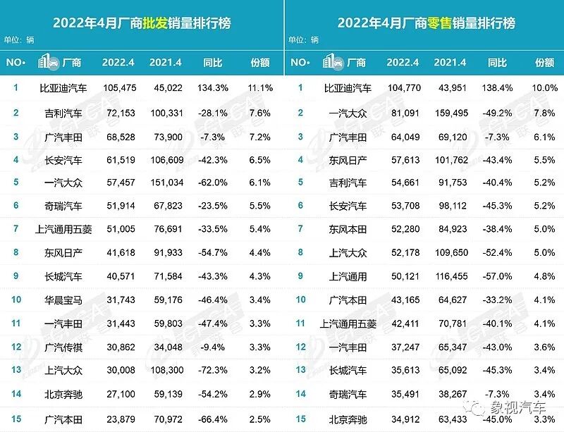 在乘联会的汽车厂商批发和零售销量两个排行榜上,比亚迪分别以105475辆和10477辆,力压南北大众等合资劲旅,以及吉利、长安等头部自主品牌,荣膺双料销冠头衔,创造了国产汽车的新纪录。