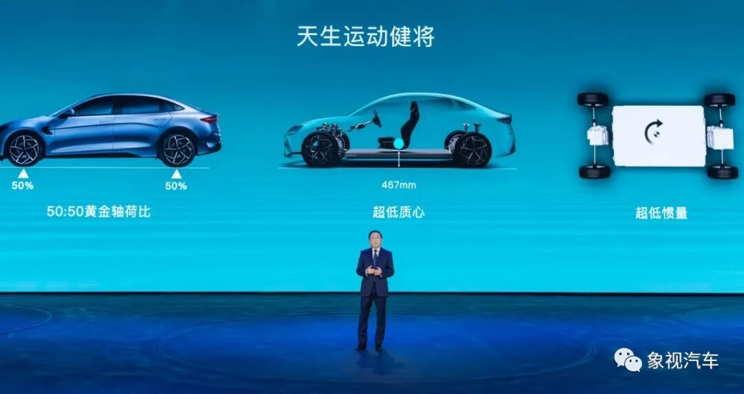 在CTB技术的加持下,得以对车身架构进行深度重塑,整车实现前后50:50的黄金轴荷配比,完全避开传统前驱车因为引擎在前而特有“头重脚轻”的先天缺陷,使得整车质心位于整车物理中心,实现纯电平台下完美的“低趴”车身运动姿态,大大提升了动力性能。