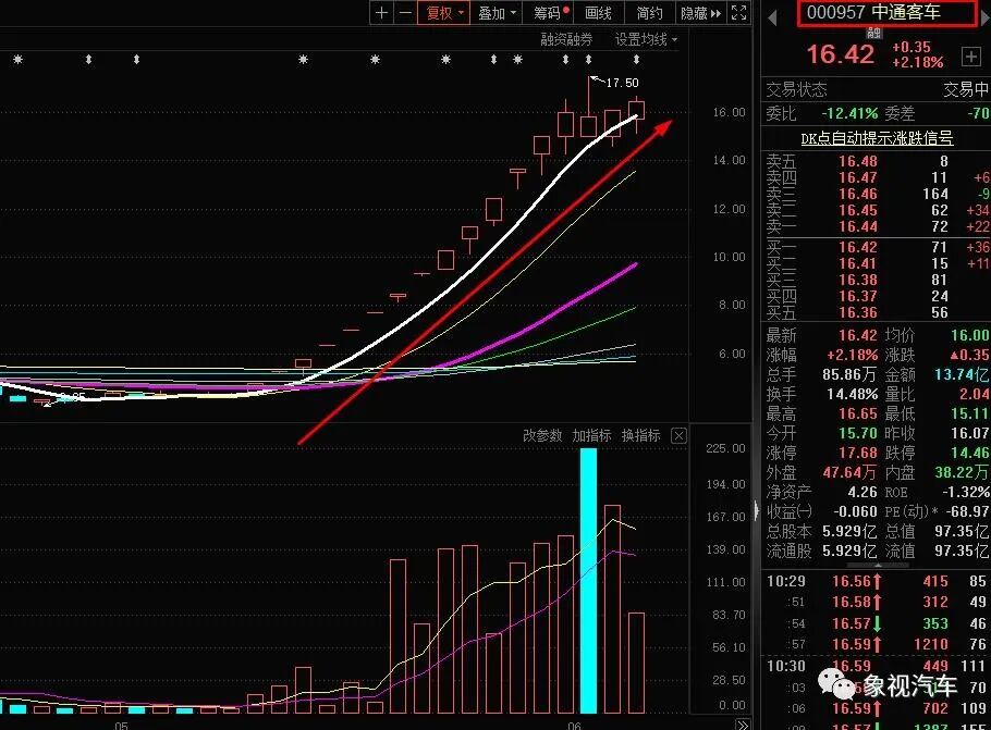5月12日收盘价为4.34元,暴涨期间一度达到17.50元。换而言之,中通客车这波涨了4倍,市值从15.7亿一路拉升至103.7亿,简直令人瞠目结舌。