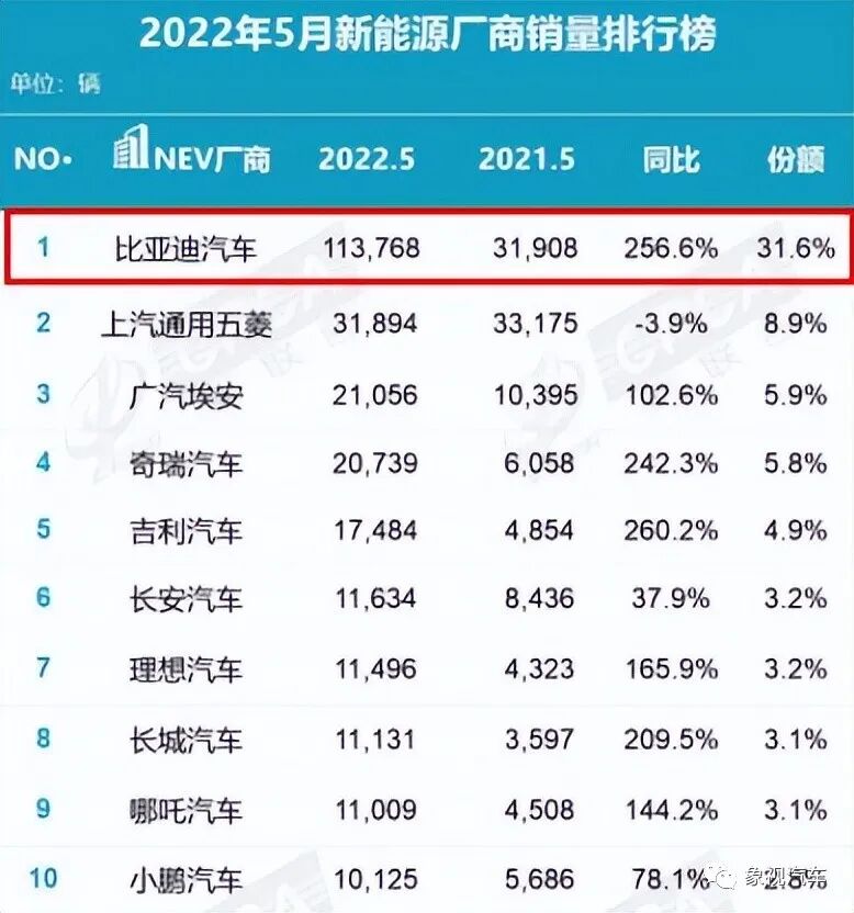 乘联会5月份新能源厂商销量排行榜上,比亚迪销量暴涨256.6%至113768台,以绝对的优势高居榜首,问鼎中国新能源汽车销量冠军。排名第二的上汽通用五菱,只有31894台;而特斯拉则仅有9825台,排名第十二。