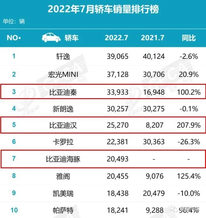 最后,比亚迪e平台3.0首款车型,纯电新物种海豚,7月份销量环比增加一倍多,以21005辆的成绩,首次跻身乘联会轿车销量十强榜单,令人惊喜。