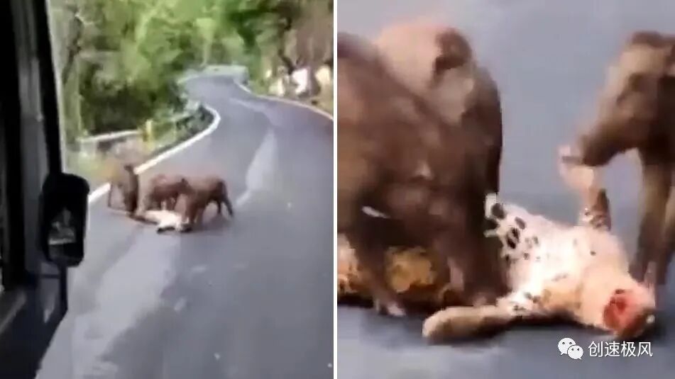 公路上,一只花豹瘫在地上,遭受着三头野猪的啃食蹂躏,竟丝毫没有挣扎,待警方赶到时,豹子早已死亡。难道花豹还打不过野猪?这是发生在2022年5月,印度泰米尔纳德邦的一件轶事,当时恰巧有一辆大巴车行至此处,才发现了这诡异残忍的一幕。当时,车上的乘客发现,不远处的山坡上,又窜出几头野猪,似乎也想加入这场“饕餮盛宴”。