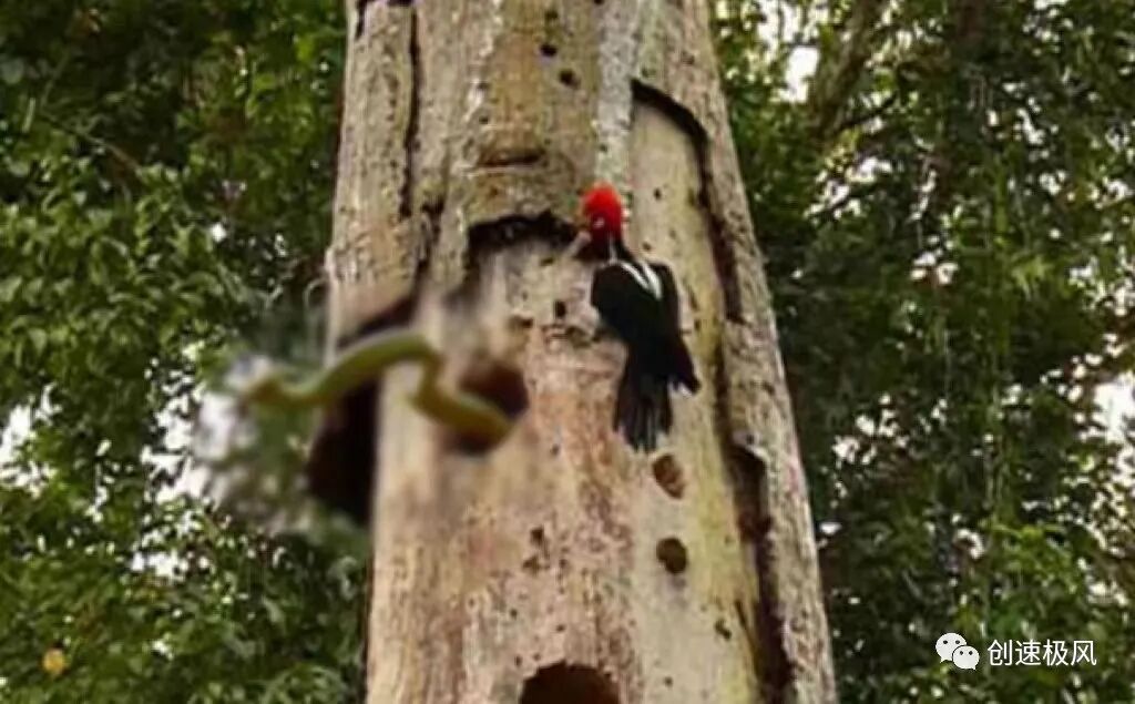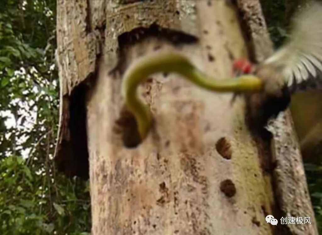 这次,还是啄木鸟主动进攻,在观察了青蛇的位置后,突然一跃而起,钻到洞口边,对着青蛇的脖子就来上几口。 但青蛇也不是好惹的,瞅准时机,一口咬住啄木鸟的翅膀,吓得啄木鸟剧烈挣扎起来,双方就这样缠斗在一起。由于半截身子悬挂在空中,头部发不出力,青蛇未能咬穿啄木鸟。 最终,在啄木鸟疯狂的摆动下,只能无奈张嘴,暂时放啄木鸟一马,啄木鸟成功脱险,向下飞去。 可啄木鸟并未就此罢休,整理一下被咬到的羽毛,接着再次来到青蛇下方,趁着青蛇分心,上去一顿猛啄。 青蛇被吓一跳,再次转身张开血盆大口,只可惜第一次这是让逐木鸟躲过了,嘴里只咬到一撮羽毛。接着,气愤的它便死死盯住啄木鸟的方向。 可啄木鸟太狡猾了,立马就飞没影了,独留青蛇机警的悬挂在洞口,不敢轻举妄动。就在青蛇以为,这只烦人的鸟终于离开时,在它背后,猛然又出现了啄木鸟的身影。 这个位置,正是青蛇的盲区,啄木鸟悄悄探头看了好几次,发现青蛇毫无反应后,再次靠近,这回,它学聪明了,对着青蛇的肚子就猛攻。