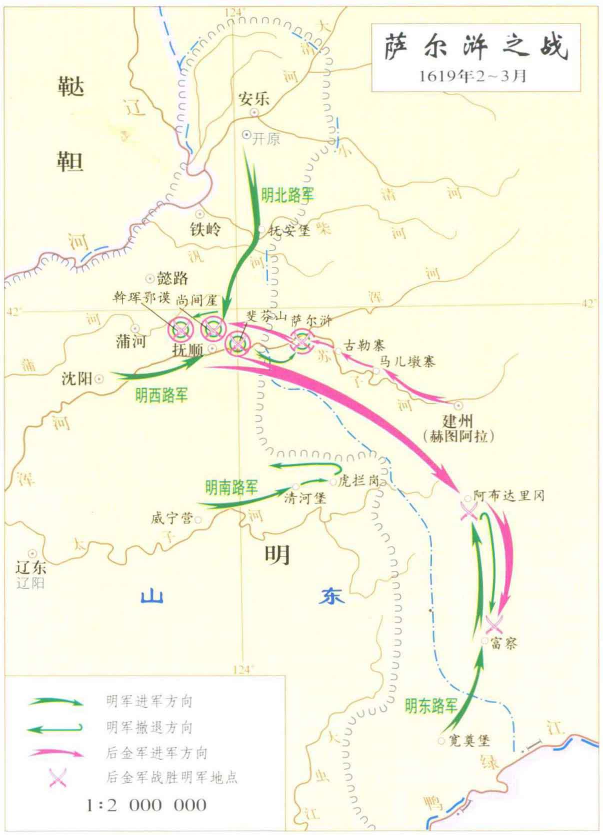 面对多路并进的明军,努尔哈赤采取“凭尔几路来,我就一路去”的战术,集中优势兵力逐步击破明军,令杜松、刘铤、马林两死一伤。