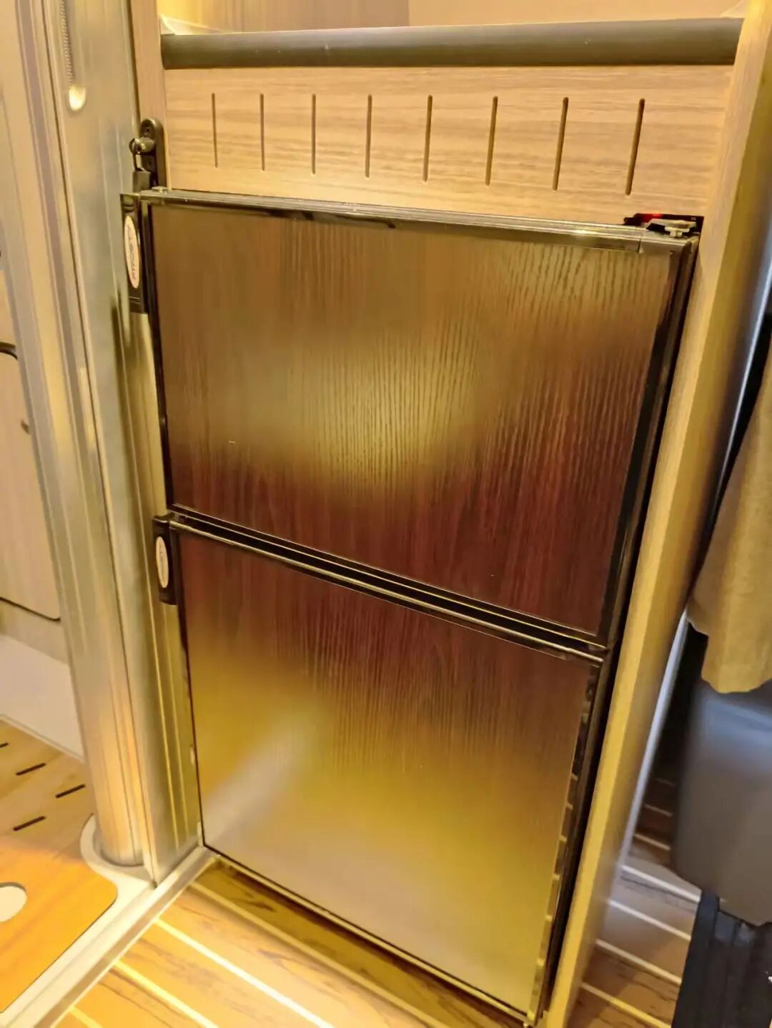 车上配备了102L的房车专用双开门冰箱,可以用来存放食物,这个容积对我来说有点大了,平常没有大把的时间出去玩儿,所以不会一次保存大量的食物,即便是出去玩儿,可能还想尝尝当地特色美食吧,冰箱之于我可能最多的用处就是酷热的夏天能随时随地喝个冰可乐,畅快