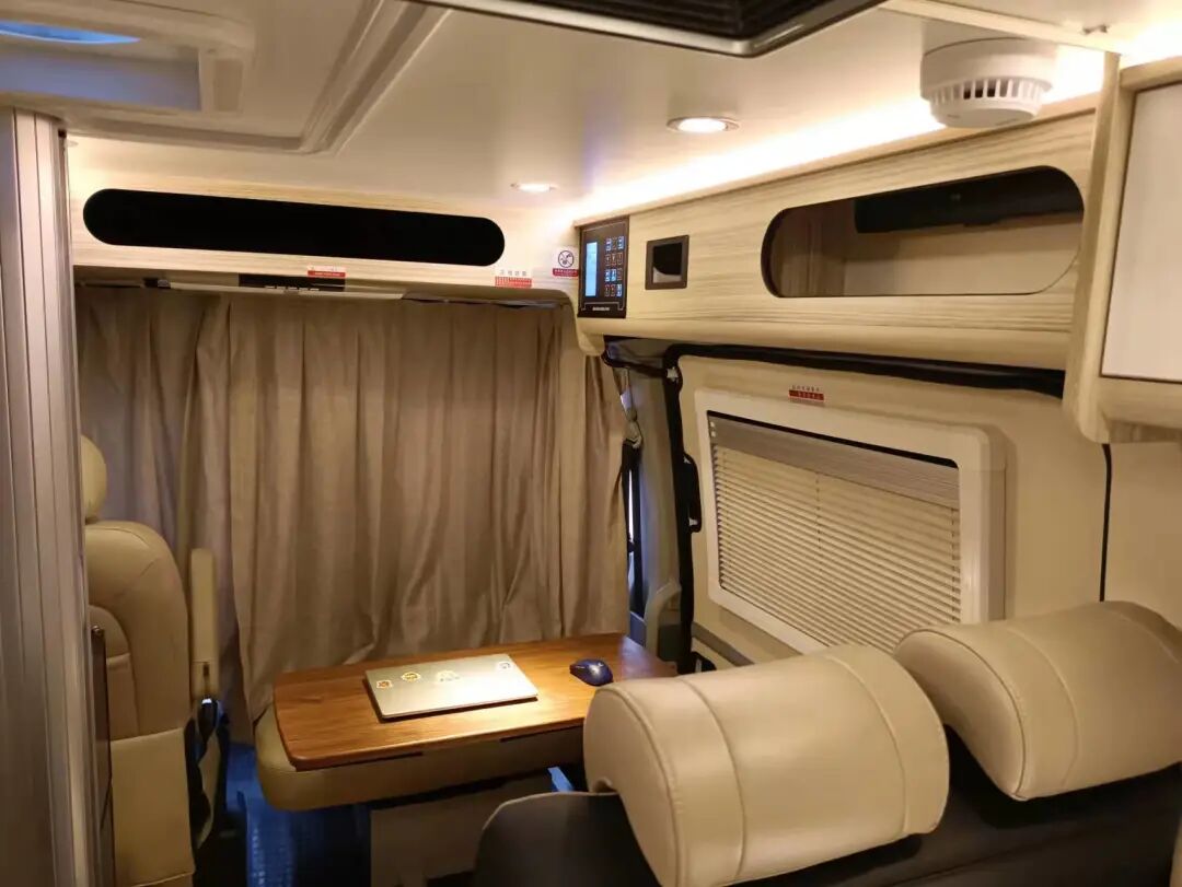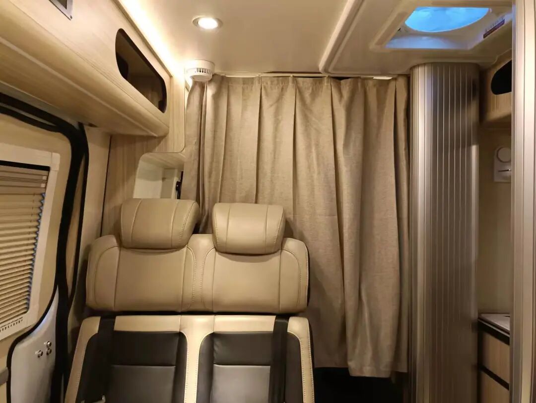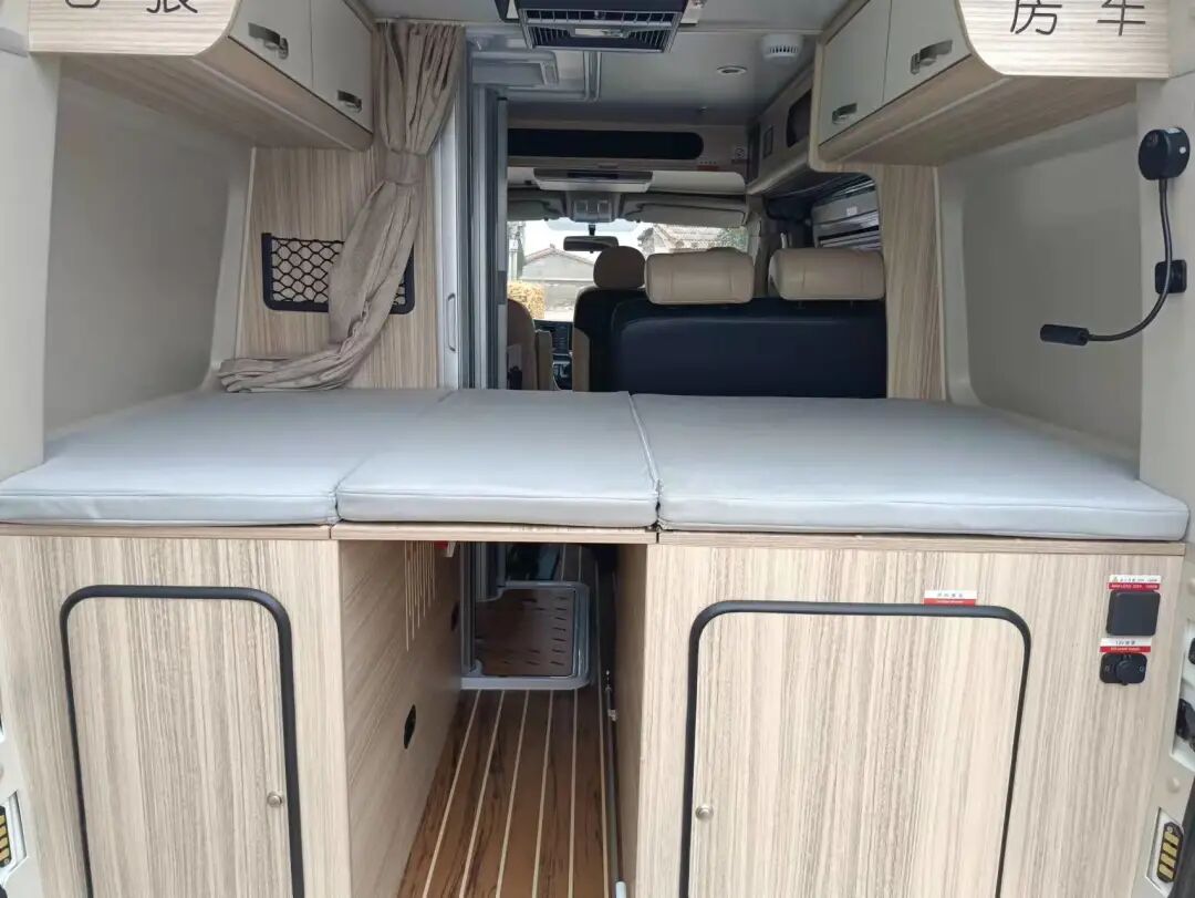 车是基于上汽大通V80PLUS底盘改装的,属于B型房车,长5米宽2米,原车高度2.34米,因为在原车的基础上加装了空调,车顶空调外机会突出20厘米左右,最终高度应该在2.5米左右,5个座位,前3后2,烧柴油