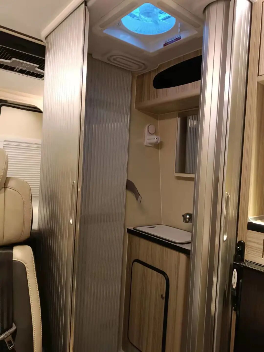车上安装了卷帘门式的卫生间,隔开了一个小小的独立私密空间,可以洗澡上厕所,一开始我是希望有固定卫生间的,但房车空间太小,如果选择固定卫生间不仅侵占了整个空间,而且显得更为拥挤,思索再三选择了这款卷帘门式的,真的试过后竟然比想象中要好用,或许是因为原本就没有太大的期待吧