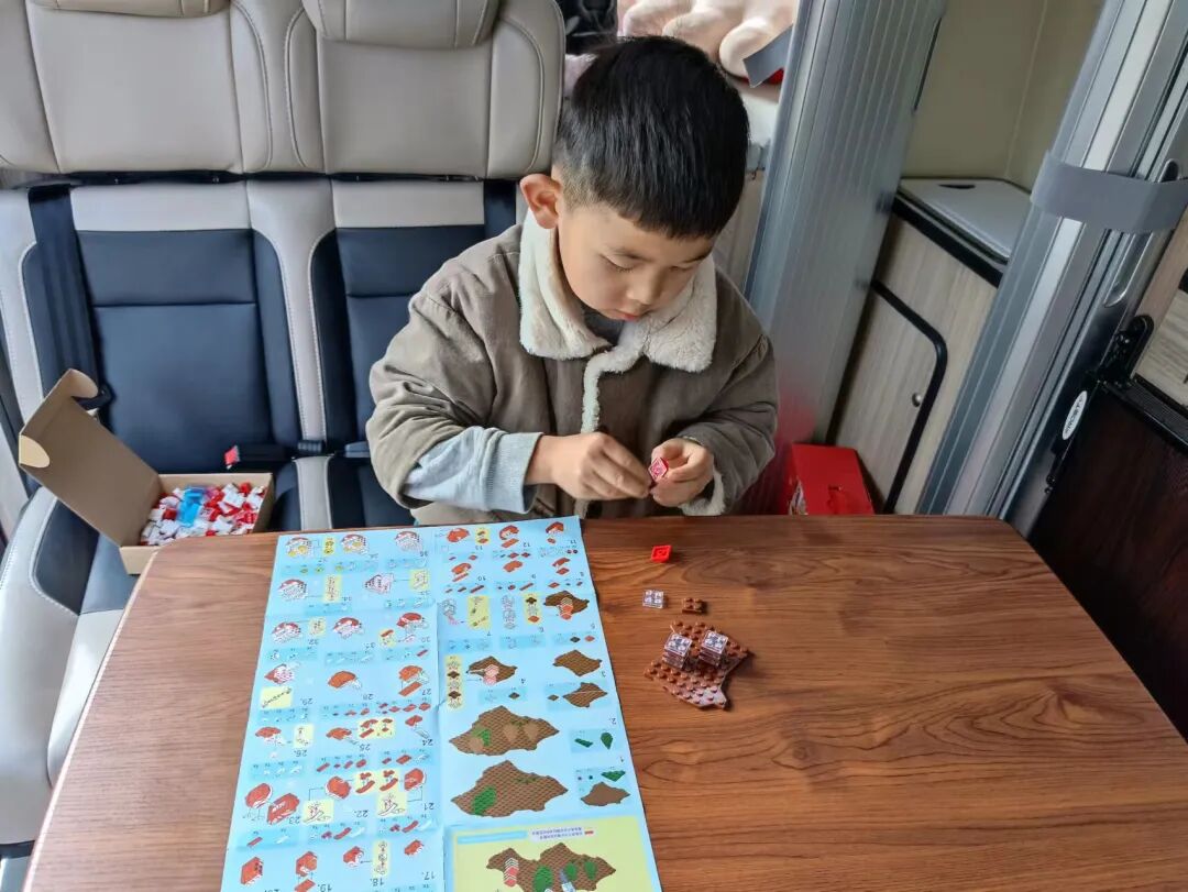 在娃快要憋疯的时候,可以带着他住在车上,就当出去旅行了,关上门窗,拉上窗帘,看看电视,玩儿玩儿积木,一方小小的天地,我们都是不亦乐乎