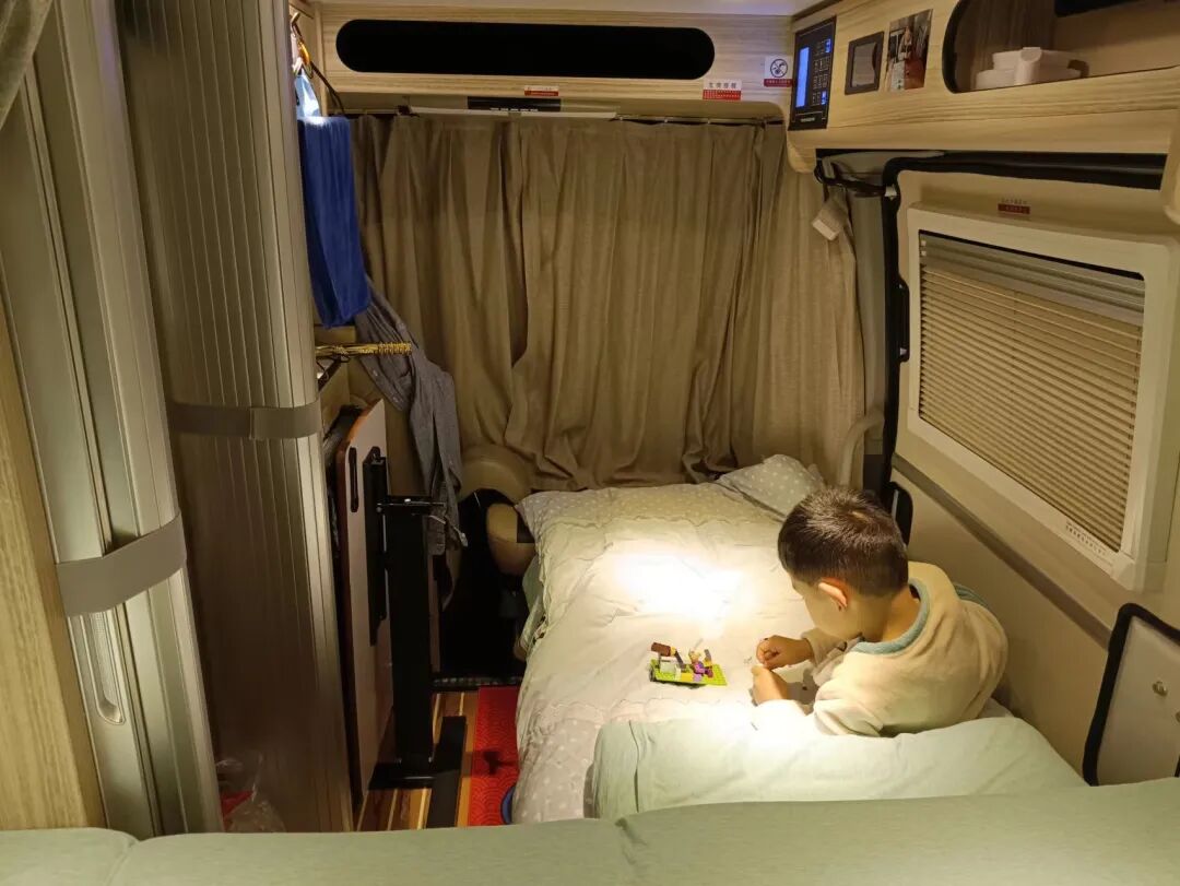 2021年12月中旬提车之后开回上海,一千多公里的路程,我带着娃,现在依然能够清晰的想到当时的兴奋与激动,路途遥远,我们不紧不慢,天黑就在服务区停下,打开电视让娃看看动画片,然后我手忙脚乱的在车上做饭,第一次在车上做饭,也就简单的煮了个面,娃很给面子吃了很多,吃完饭一起看电视,困了睡觉。第一次在房车上做饭睡觉,也算是正式开始使用房车了,感觉还不错