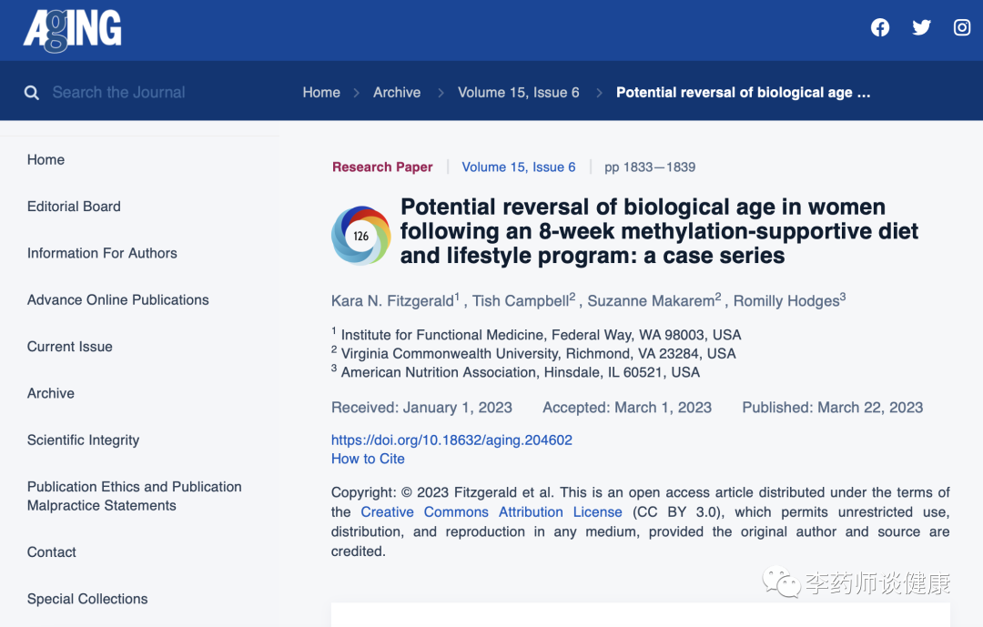在这项研究中,研究者对6名女性参与者进行了支持甲基化饮食和生活方式改变计划,这些计划包括了饮食、睡眠、锻炼以及放松指导,补充益生菌和植物营养素等方面的改变,通过为期8周的计划执行,对改变生活方式对这6名受试者的DNA甲基化和生物衰老影响,做出了评估和测试。