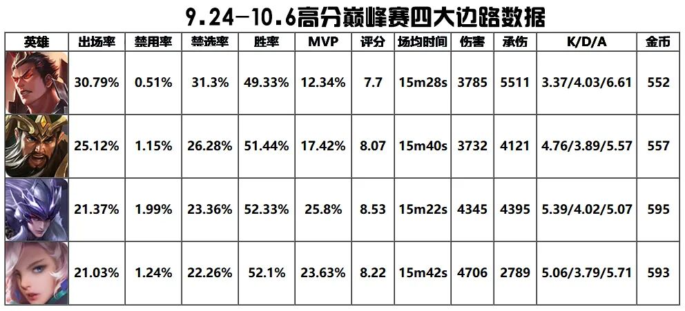 黄刀吕布、关羽、马超、元歌这四个对抗路英雄,依旧占据高分巅峰赛一半的出场率。而且,我们从上面数据可以看出,马超和元歌的经济、mvp率都远高于关羽和吕布,这两个英雄的个人操作空间更高。