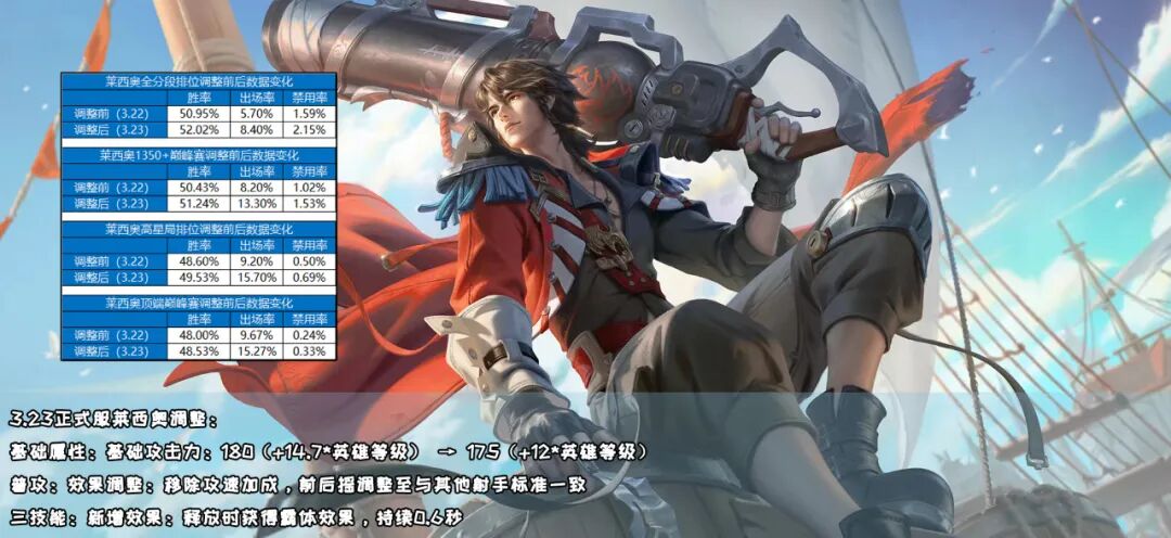 再加上大招的调整,莱西奥输出的稳定性也有了些保障,这也使得他在各分段的出场率、胜率都上升了许多。