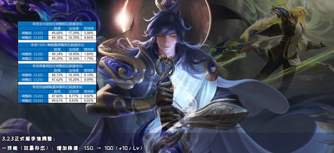 李信的整体数据变化不大,只有全分段排位赛的些出场率略微降低了些,主要是因为现在基本上都是光信,唯独排位赛中暗信会热门一些。