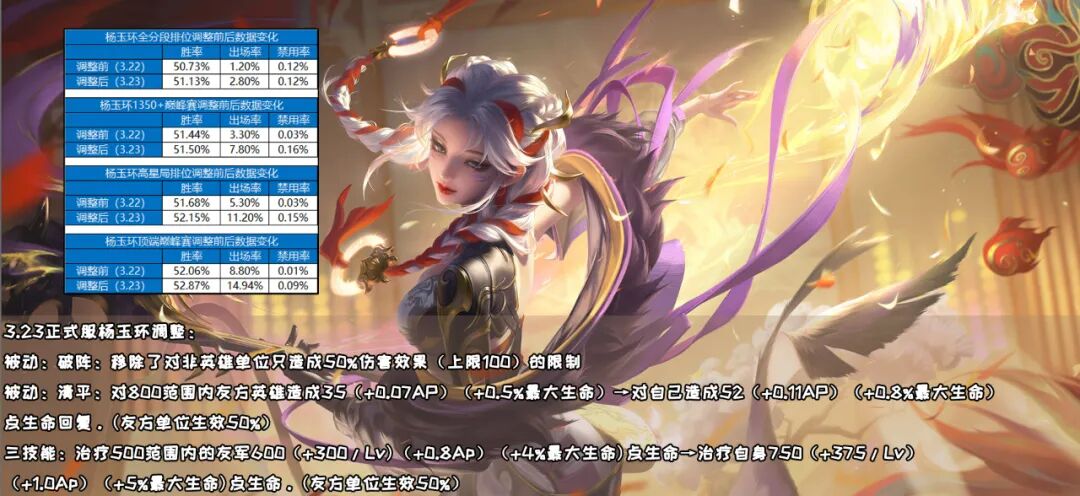 调整后,杨玉环在低分段排位赛的数据变化变化不大,但在其余三分段,她的出场率可谓是暴增,已经一跃进入了热门行列!