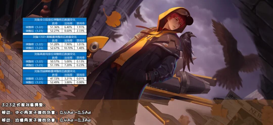 大家好,我是大宝备。3.23正式服更新一天后的数据已经出炉,让我们一起来看一下这次调整涉及到英雄的实际数据变化!