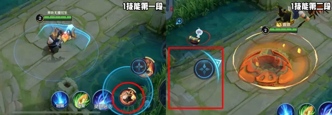 猪八戒1技能第一段用技能轮盘控制,第二段用方向轮盘控制,1技能弹跳位置是猪八戒所有操作的难点,因为只有第二段附带击飞效果,一旦第二段控制不到敌人,可能会造成很多伤害连招打不出来!
