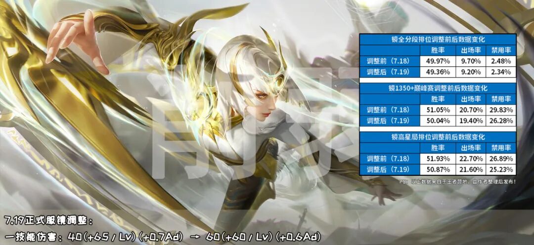 7.19正式服更新中,对5位英雄(镜、百里守约、戈娅、沈梦溪、赵怀真)做了调整,而更新后的数据也已经出炉,就让我们来看下这些英雄的强度产生了什么变化。