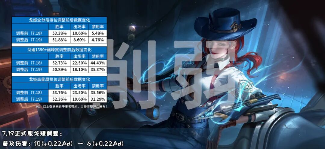 戈娅这次调整影响还是挺大的,三分段的各项数据都下滑了许多,其中,巅峰1350最为明显,不仅胜率处于50%的边缘,禁用率也直接下滑了将近10%。