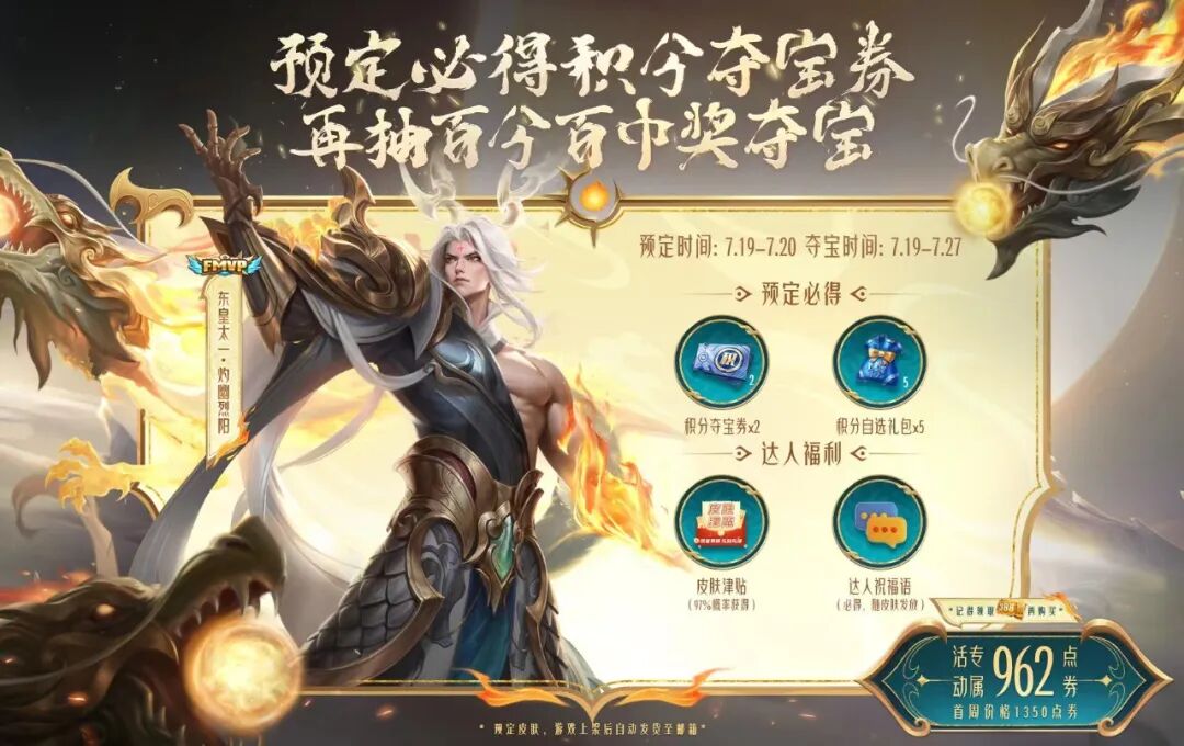 东皇太一的「灼幽烈阳」已经上架大宝备小店,首周的活动专属价只要962点券。现在预「灼幽烈阳」更有超多福利等你拿~
