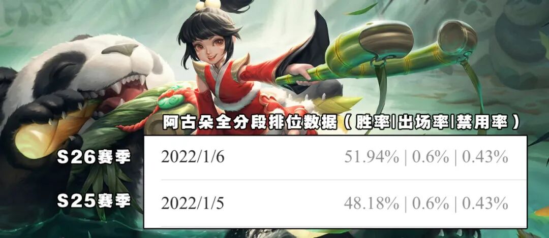 阿古朵的胜率上升了3.76%。由于阿古朵骑着球球时,熊的生命值也被算作为额外生命,在契合新版肉刀、血魔的同时,前中期就能拥有比其他英雄高几倍的装备被动附加伤害。这名曾经一度被称为“下水道”的英雄完美吃到了本赛季的版本红利,或将崛起!