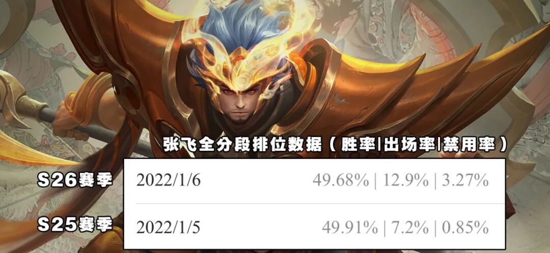出场率虽然暴涨了5.7%,但胜率却有所降低。张飞的专精装在新赛季中与达摩的一起上线,自然也拉动了玩家们使用张飞去开拓新玩法,因此促进了出场率增长。