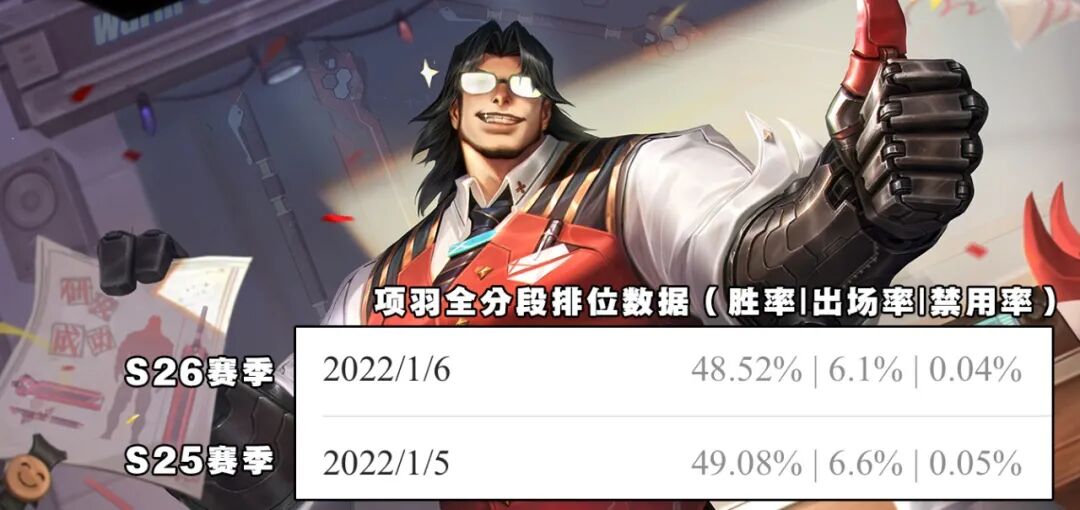 项羽的各方面数据变化不大。虽然新赛季对项羽进行了一波加强,使他更适合走对抗路了,但基本的打法思路还是不变的;并且由于装备调整,其他对抗路也或多或少得到了增强,使得项羽的出场率也不增反减了。