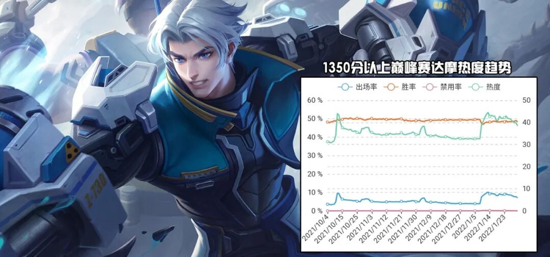 而且也正是因为专精装的关系,无论是在高分段还是巅峰1350分,达摩的出场率对比上赛季都有所上涨。