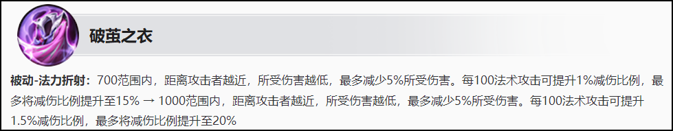 被动生效范围增加了300码,减伤比例也提升了5%,总体来说性价比得到了提高,但只适合对于需要贴脸打输出的法师,以及法系打野,例如貂蝉、高渐离、芈月。