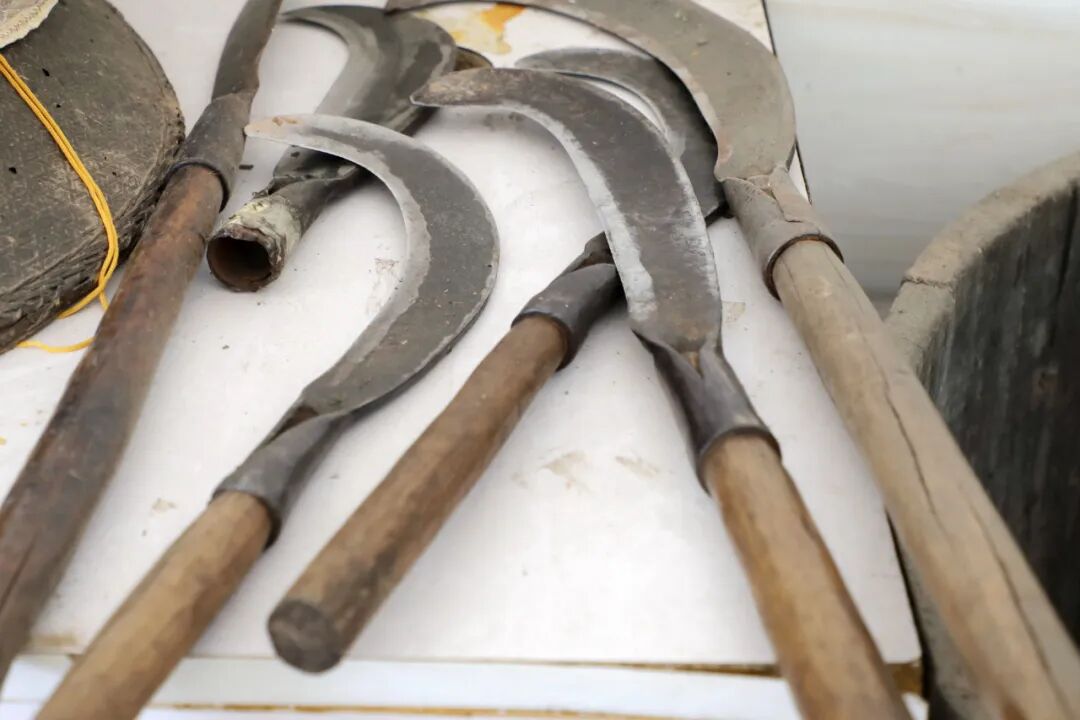 弯刀、镰刀,这是在大山深处一农户家随意拍到的,里面有弯刀、镰刀等各种工具,在农村、特别是在山区,这些弯刀、镰刀发挥着重要作用。农民可以用它来砍柴、割稻、割猪草等,70年代、80年代是农民朋友劳作时的好帮手。