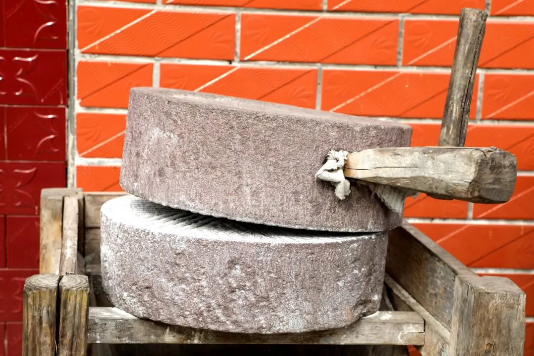石磨是由民间的石匠用石头雕琢而成的,有大的也有小的,基本上由上磨、下磨和磨盘、磨架、磨推把组成。上磨边上有一个方形的孔,镶嵌进去的那根弯弯木棒,那是磨把,用手推磨把,石磨就开始转动工作了。