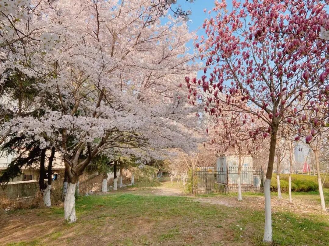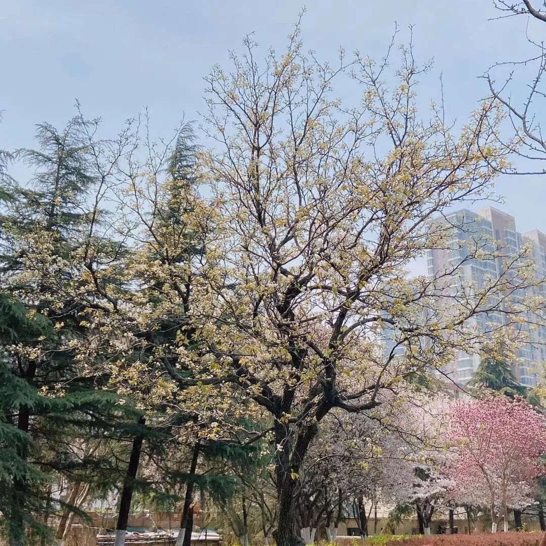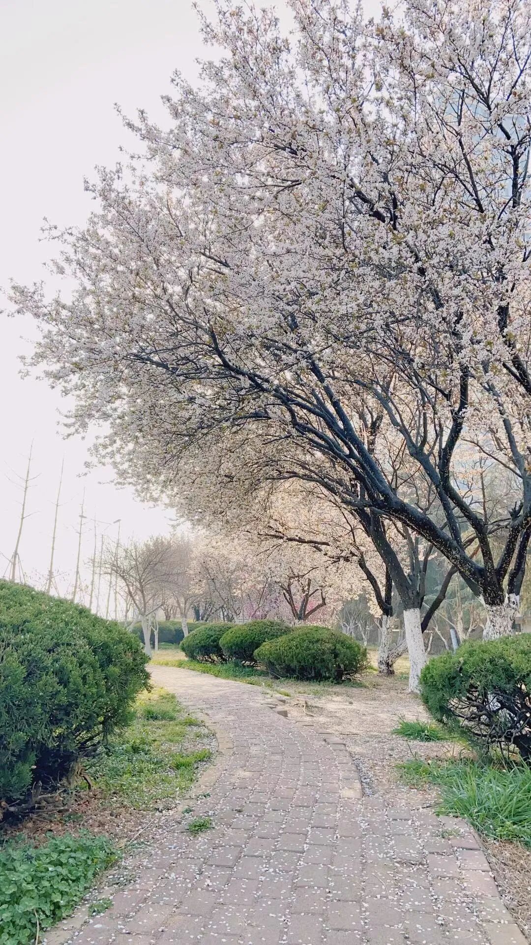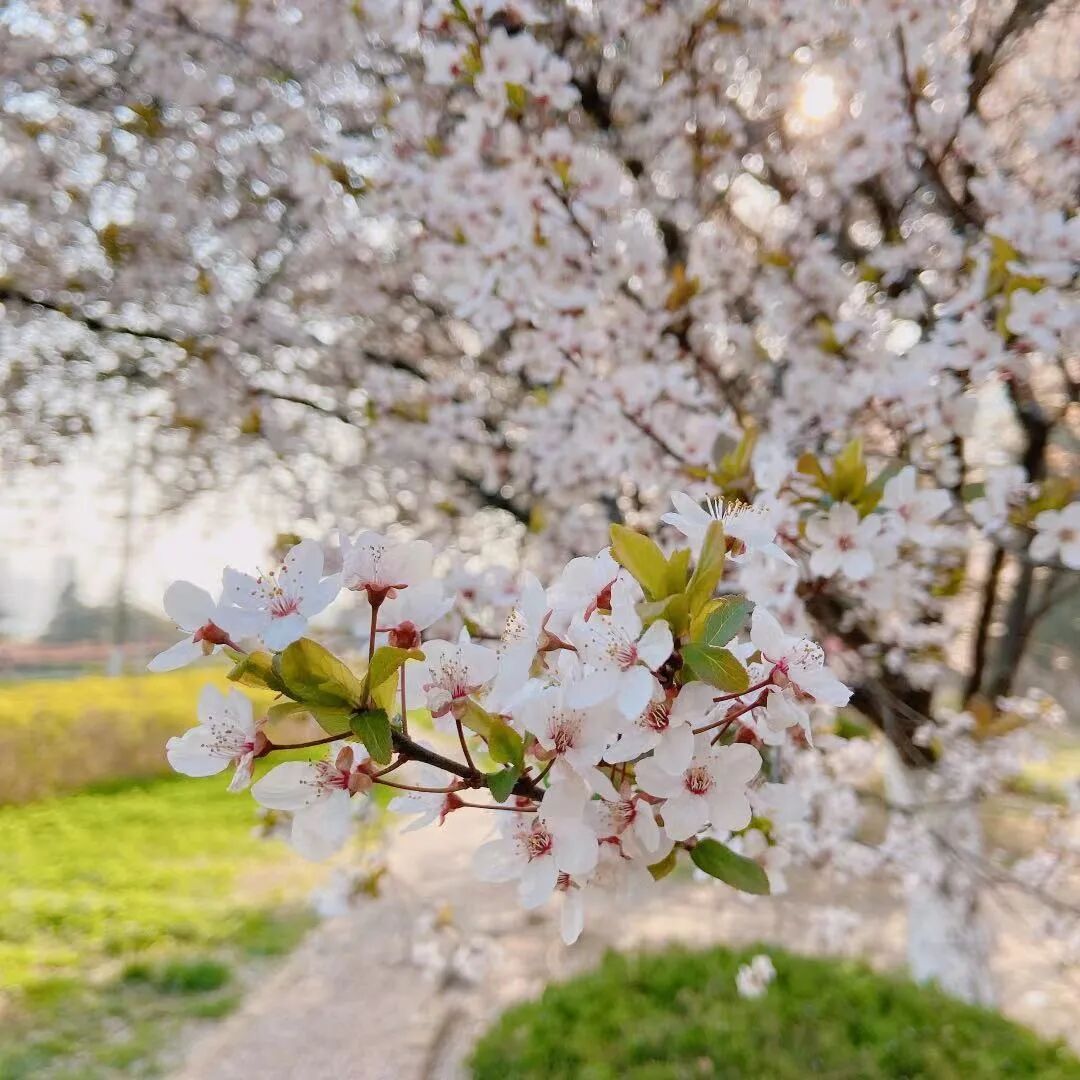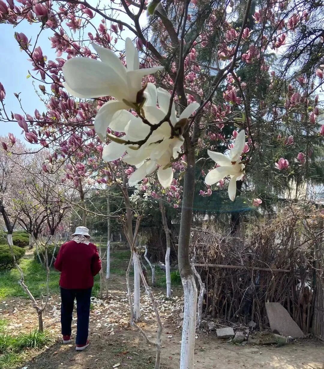 那天早上我去滨河步行道散了个步。看到海棠梨花含着苞,李花桃花樱花开得正旺,白玉兰花事渐近尾声……就想让我妈也出来看看花。