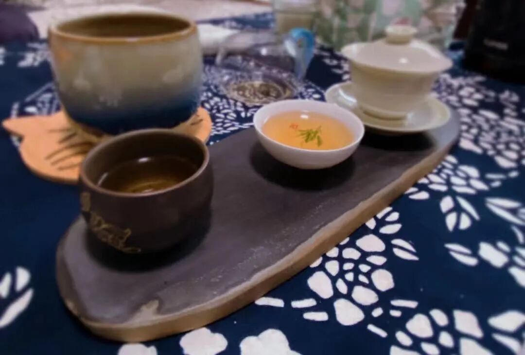 中间白色的茶碗是觉主在成都买的。大概因为上面的手绘竹子图案,我以为它适合喝绿茶。